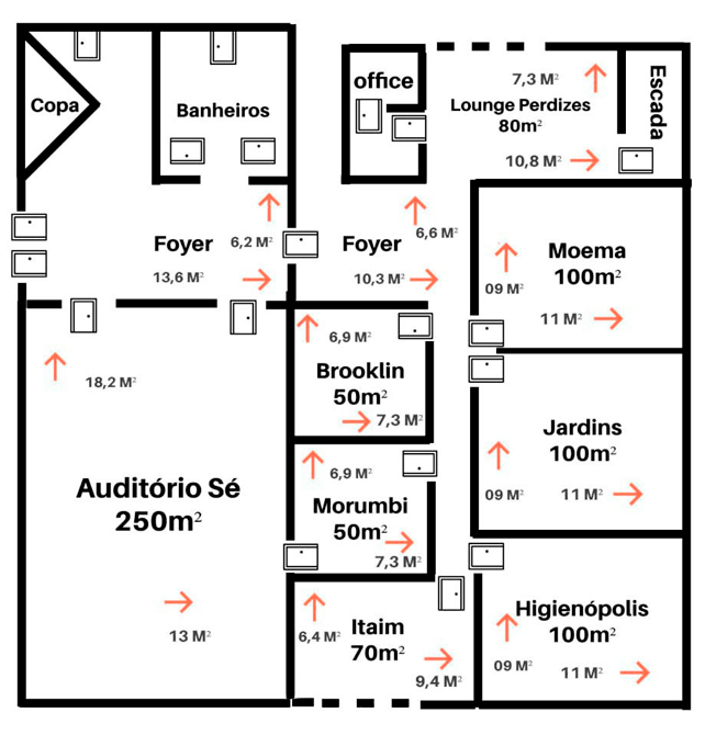 Contamos com Auditório para 110 pessoas, camarim, 02 salas de 100m² , 01 sala de 60m² 01 sala de 100m² que pode ser configurado de acordo com a sua necessidade.